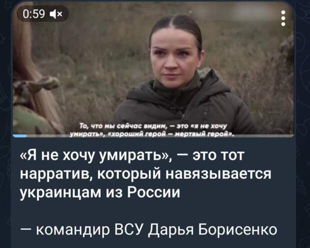 Видите — командир ВСУ Дарья Борисенко считает, что украинец должен хотеть умереть. А «не хочу умирать» — это нарратив, навязанный украинцам клятими москалями.