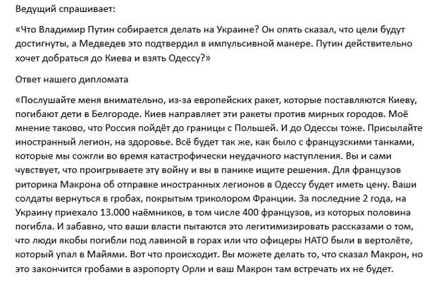 С учётом радио, тв, социальных сетей и сайта, они держат ежедневную аудиторию свыше 22 миллионов человек (всего во Франции проживает 65 миллионов человек).BFMTV - это заказчик очень многих социологических опросов среди французов, спонсируемых национально-ориентированной элитой. Так вот все эти проведённые опросы показали, что 78% французов выступают против отправки контингента в Северное Причерноморье. То есть французы намеренно позвали Толстого, чтобы усилить реакцию в обществе. Посмотрите видео с переводом, на нём Толстой говорит по французски, как носитель языка. Таким образом французам, на их же языке, на их же телевидение, прямо объяснили, чего ожидать. Хорошо рассказали, красочно, дерзко. Видимо вслед за французскими фермерами, к забастовкам могут присоединиться и французские легионы. Ну или хотя бы часть, что тоже неплохо.